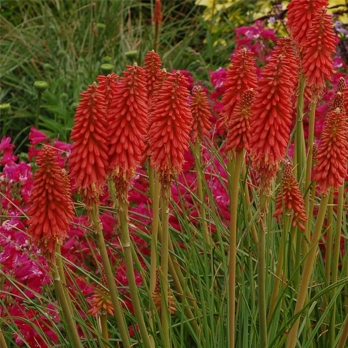 Leuchtend rote Blütenkerzen ragen über der grasgrünen, wintergrünen Belaubung empor und bilden einen wundervollen Blickfang in jedem Staudenbeet. Guter Durchtrieb und schöner, kompakter Wuchs. Besonders lange Blütezeit bis in den Herbst hinein. Fackellilien gedeihen besonders gut bei durchlässigem Boden und an sonnigen Standorten. Eignet sich gut den Vasen-Schnitt.