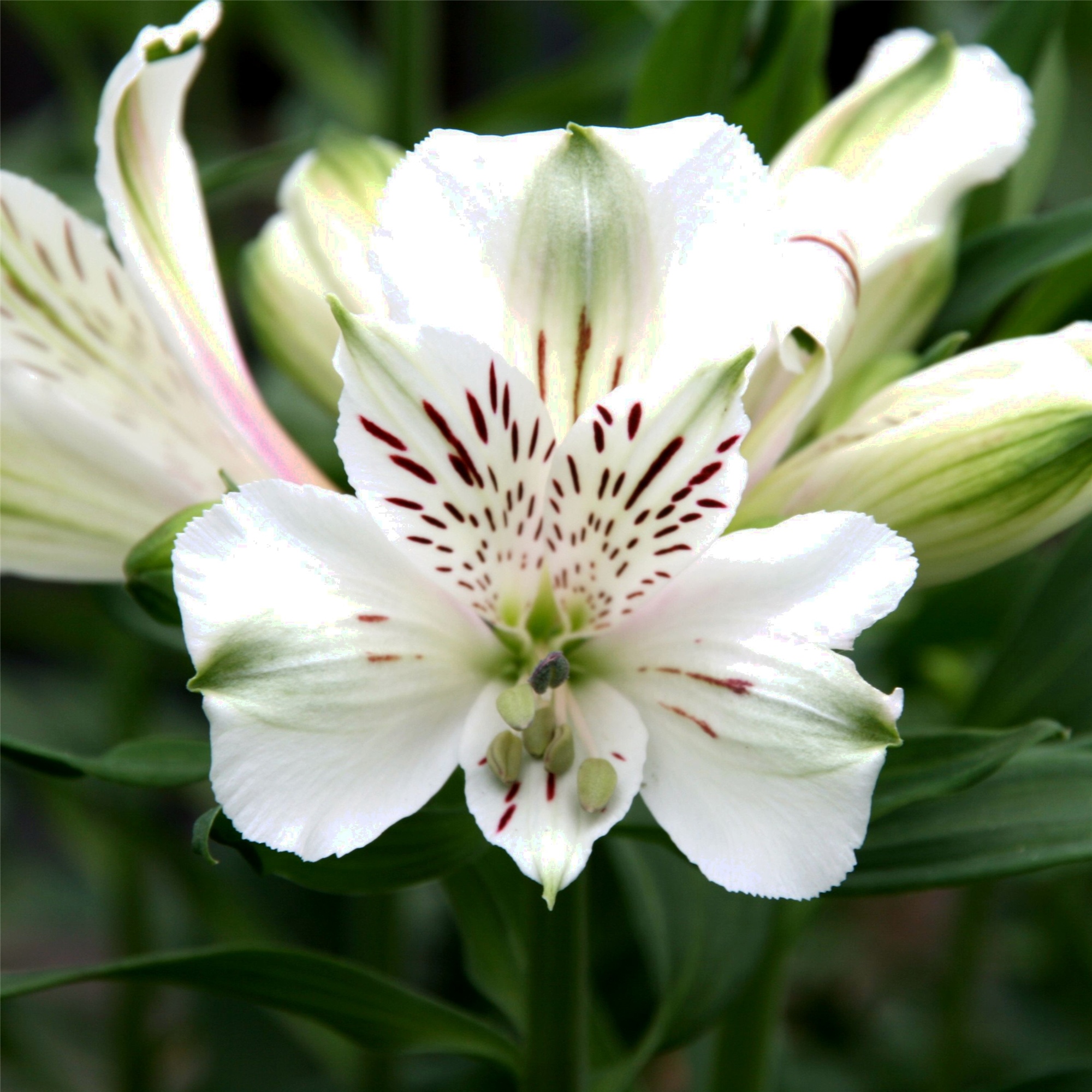 Charakteristisch für Inkalilien sind die wie gemalten gestrichelten inneren Blütenblätter. Die Majestic Maze zeigt sich in edlem Reinweiß mit zarten dunkelroten Strichen. Die wunderschönen Blüten erscheinen unablässig den ganzen langen Sommer und eignen sich sehr gut als langlebige Schnittblumen. Das Abschneiden von Verblühtem fördert weitere Blüten.